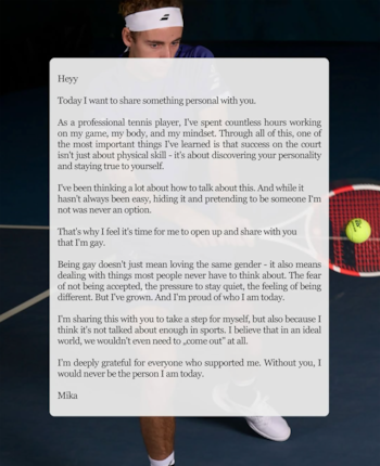 El tenista suizo Mika Brunold decidió compartir públicamente su homosexualidad. Además, explicó sus razones en un extenso mensaje difundido en redes sociales. El joven de 21 años ocupa actualmente el puesto 307 del ranking ATP. Asimismo, compite principalmente en el circuito Challenger del tenis profesional.